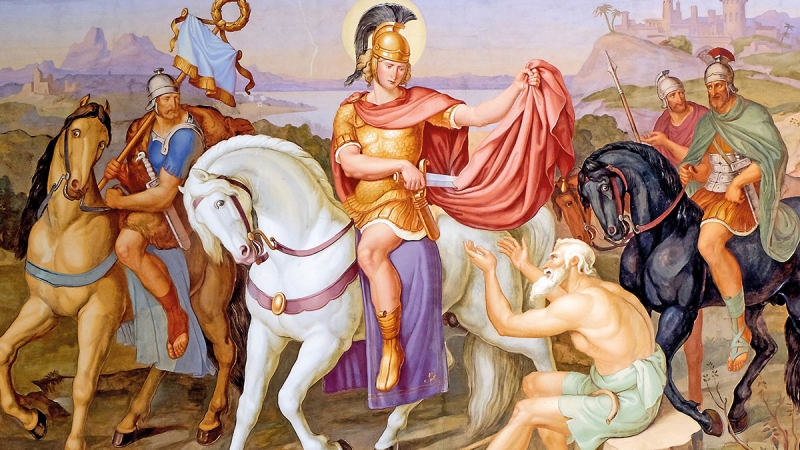 Durante más de 15 siglos ha sido recordado nuestro santo por el hecho que le sucedió siendo joven y estando de militar en Amiens (Francia). Un día de invierno muy frío se encontró por el camino con un pobre hombre que estaba tiritando de frío y a medio vestir. Martín, como no llevaba nada más para regalarle, sacó la espada y dividió en dos partes su manto, y le dio la mitad al pobre. Esa noche vio en sueños que Jesucristo se le presentaba vestido con el medio manto que él había regalado al pobre y oyó que le decía: "Martín, hoy me cubriste con tu manto".