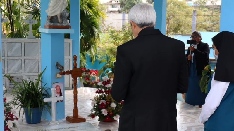 Antes de pasar el comedor a degustar los alimentos, el Arzobispo rezó un momento frente a la tumba de la Madre Vicenta, fundadora de la congregación que partió a la casa del Padre en el año 2010.