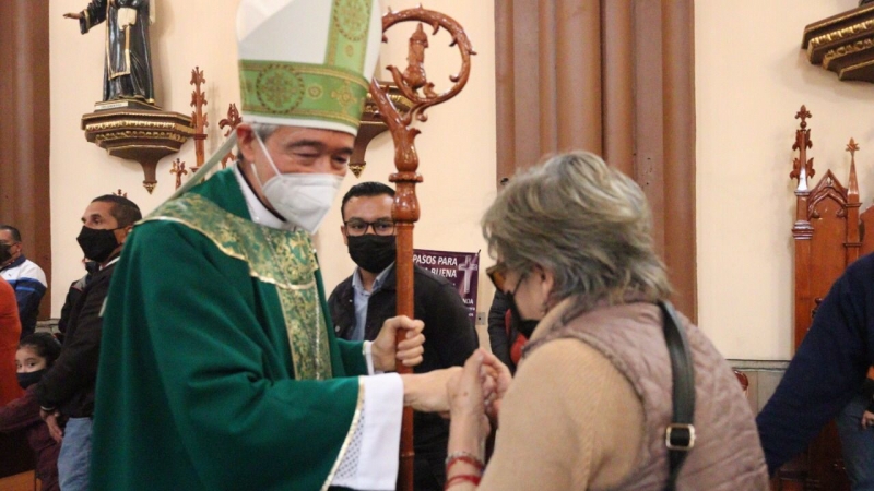 Al ingresar saludó a los fieles que se agruparon sobre la nave central y lateral, durante la homilía Monseñor Patrón dijo que Jesús nos invita a vivir tres sabidurías, mismas que nos iluminan para el tiempo de cuaresma, son tres sabidurías prácticas de Jesús: